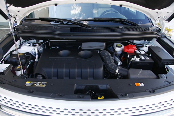 XLTエコブーストに搭載される2リッター直列4気筒直噴式インタークーラー付ターボエンジンのスペックは、243ps/5,500rpm、37.3kg-m/3,000rpm。3.5リッターV6エンジンと比べると、パワーで51ps劣るがトルクは2.1kg-m勝っている。最大パワー、最大トルクともに、その発生回転数がV6よりも低回転なのは驚きだ。