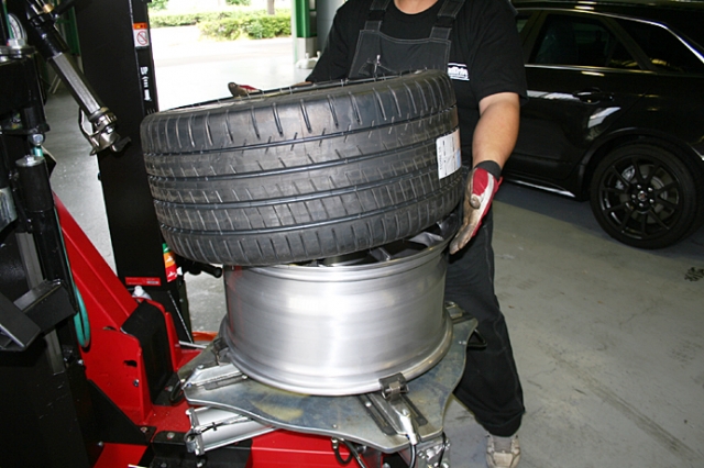 今回タイヤを交換するホイールは、HREのP43SC。2012年の最新モデルであり、最軽量ホイールという。これに装着するタイヤはミシュランのパイロットスーパースポーツ。恐らくタイヤホイール込みで100万円はくだらない。「安かろう悪かろう」ではないからこそ、こういった高額商品でも任せられるのだ。