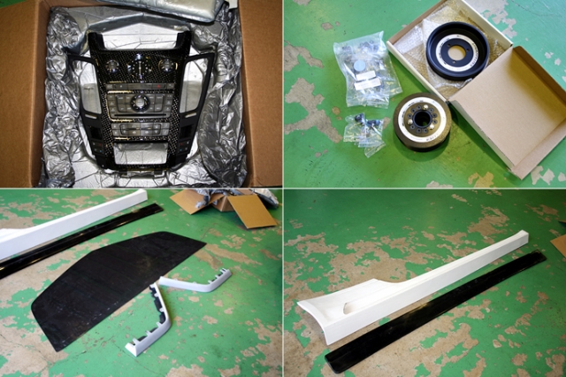 作業前に撮影させてもらたパーツたち。カーボン製のインテリアパーツにスーパーチャージャーのプーリーやインジェクター。そしてサイドスカートとフロントアンダースポイラーの一部分。これらを順に装着していった(エンジン系に関してはこれからの予定)。