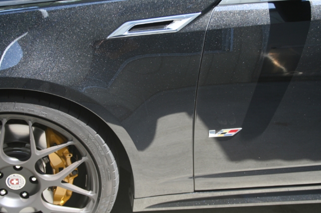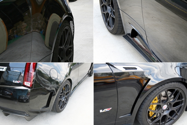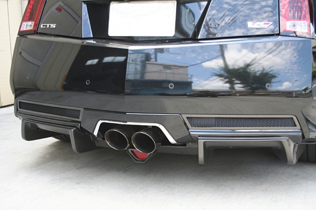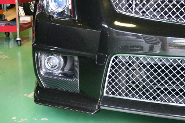 実は写真下記のCTS-Vみたいなフロントアンダースポイラーの装着を試みたが、パフォーマンスという観点において、高速域での耐久性に不安ありという判断で、今回は装着を見送っている。