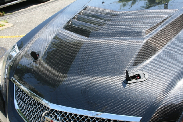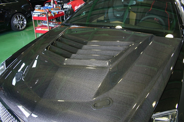 写真左はカーボンフードを装着した300C。それに比べ盛り上がったフードが特徴のCTS-V。このフードは、スーパーチャージャーエンジンが搭載されているCTS-Vならではの逸品なのである。