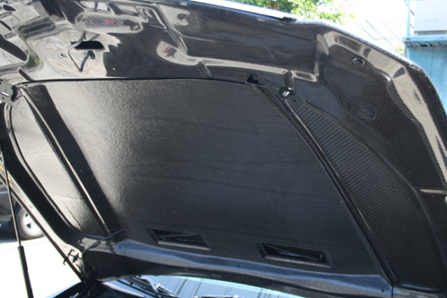 見た目のインパクトがもの凄い、フルオーダー製のカーボンフード。これに装着されているフードピンも個性的であり、高速走行時の風圧によるボンネットの安全性を高めるために自社装着。埋め込みタイプだが、ジャパンクオリティで見事装着完了。