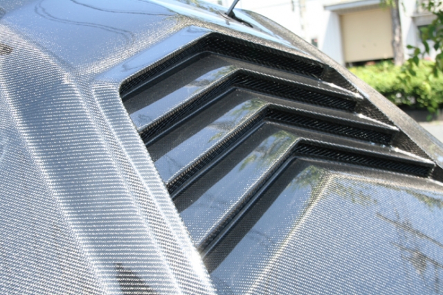 今回手を入れる部分を具体的に言えば、まずはボンネットフードをカーボン製に換え、フロントスポイラー下部にアンダースポイーラーを装着し、フロントフェンダー、リアフェンダー、そしてリアバンパーにエアダクトを設ける。またリアバンパーにディフーザーを設け、細かいところではリアバックランプに台座を取り付ける等。実際にはこの他にも作業が続々と追加され、フロントフォグベゼルとリップスポイラーもカーボンパーツに交換されている。