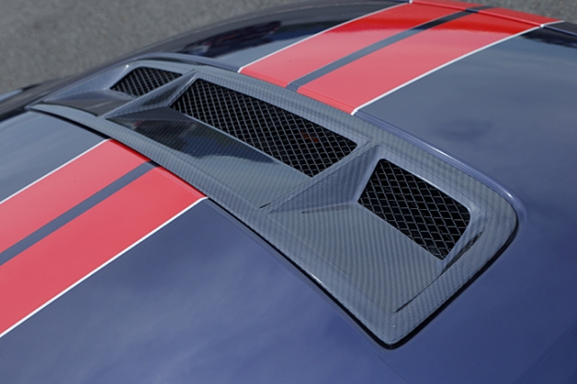 ボンネットフードのダクト口にカーボンパーツを装着。