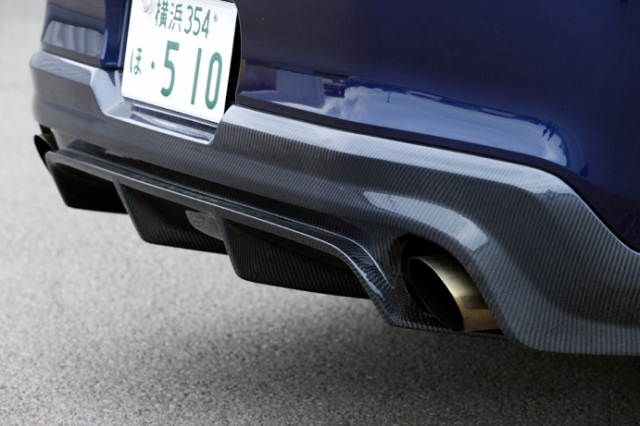 リアはバンパー下部にカーボンパーツのディフューザーを。これらエアロパーツにて高速時の整流効果を発揮することでタイムが上がることが期待される。