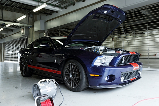で、今回お邪魔したのが富士スピードウエイでの走行テスト。シェルビーGT500くらいになるとサーキットで走りたいというユーザーも多く、彼らに勧められるパーツや仕様、またはデータ等をきっちり集め、フィードバックできるようテストを行っている。今回で2回目のテストとなるという。