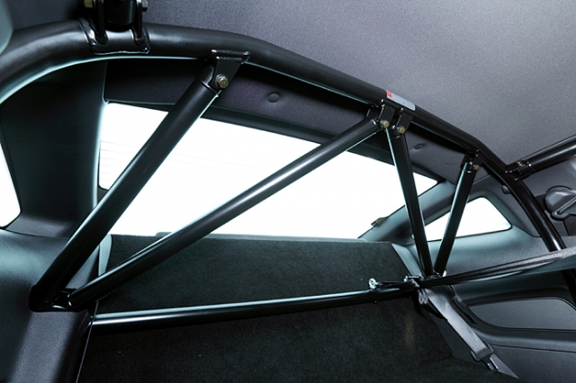 室内にロールゲージを入れてボディ剛性の向上につとめる。バケットシートにロールゲージの組み合わせで乗り降りがしにくくなるが、サーキットでは効果覿面。