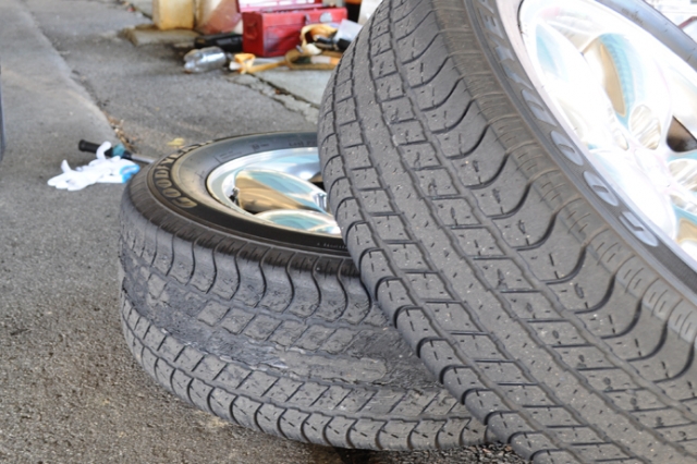 後輪の空気圧は4.5。今回は走行の合間に一度タイヤを交換して様子を見ているが、装着したタイヤはいずれも「グッドイヤー・ラングラーHP」だった。ただ、2本目の走行時には硬くて路面を噛まない古いタイヤを使用していた。高橋さん曰く、「本当はスタッドレスにしたかったんだけど、良いのが見つからなくてね」とのこと。