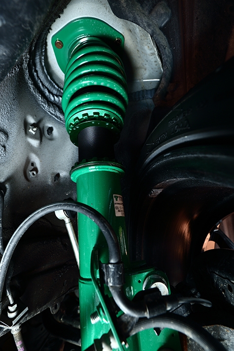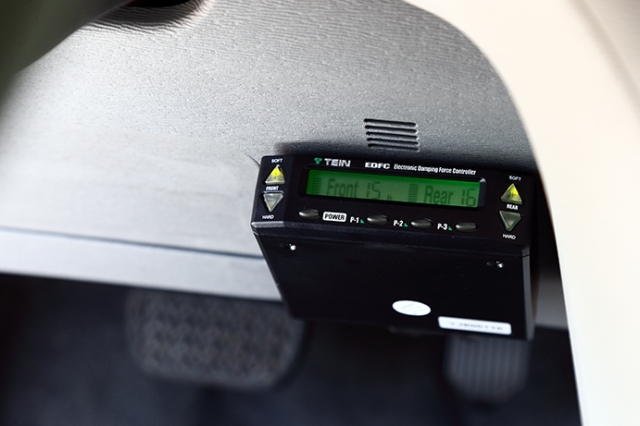 目印となるグリーンのカラーリングが特徴のテイン。車高を変えても乗り味に変化がないよう、ショックケースの全長を調整し、反発の少ない、ストロークがたっぷり取れる複筒式を採用する。さらに16段階の減衰力調整式となる。今回は、テインが別途発売している商品、EDFC(エレクトロニック・ダンピング・フォース・コントローラ)を同時に装備し、クルマに乗ったまま減衰力が調整可能となった。