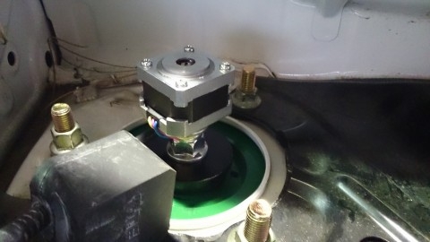 本来ダイヤル調整式ショックだから、フロントはボンネットフードを開けて調整することになるが、EDFCを装備すれば、ごらんの写真のように本来ダイヤルがある部分に高性能ステッピングモーターが装備され、車内に設置したコントローラから遠隔操作することで減衰力がコントロール可能になる。