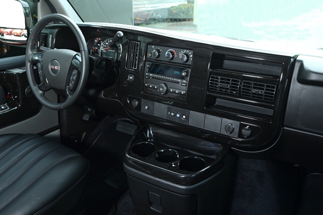 エクスプローラー社によって装飾されたインテリア。ブラック一色のインパネに、デナリブラックのウッドを使い仕上げている。全体的に質素なノーマルインテリアが、劇的に雰囲気を変えている。ブラックウッドの質感はかなり高く、サバナによく似合っている。