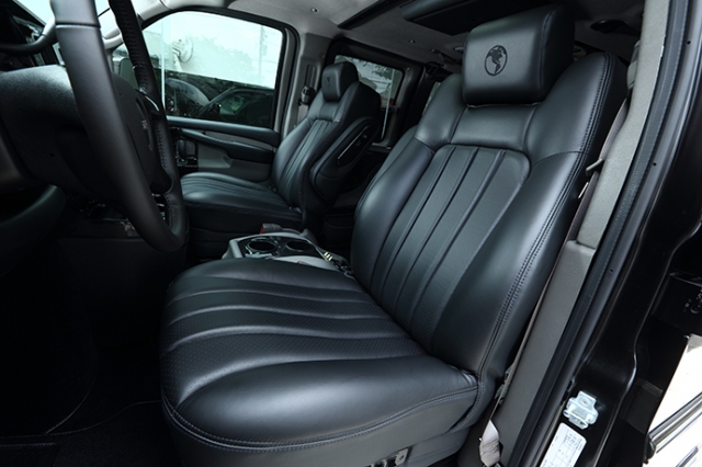 ブラックのボディに大きなフロントグリルとボディサイドに装飾されているアグレッシブなエアベント、そして20インチホイールのデザインや車高等の見事なバランスがもたらすアメ車ならではの大迫力。まるで「黒い弾丸」のごとき引き締まった全体の雰囲気は、現行サバナだからこそ出せる味だろう。