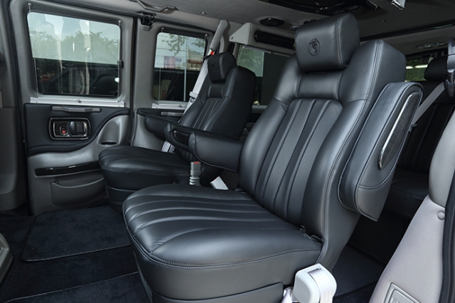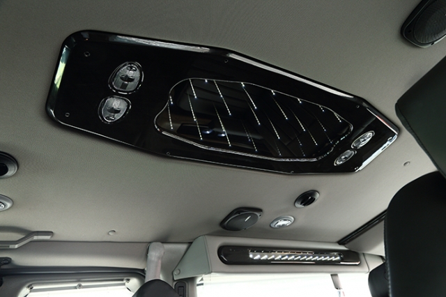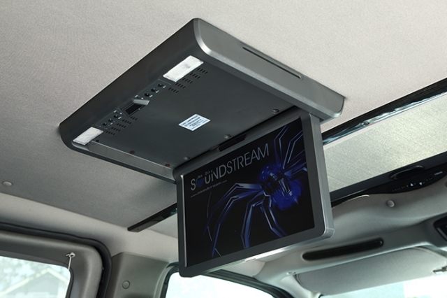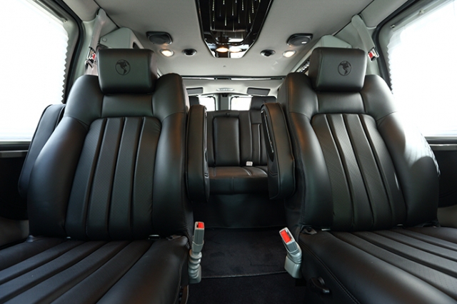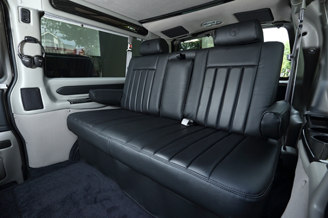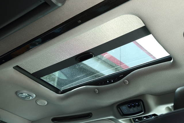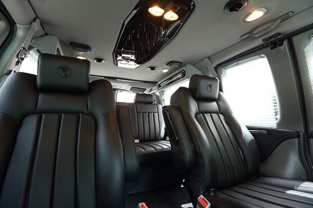 LEDイルミネーションの他に15インチフリップダウンモニター&ブルーレイプレーヤー等が装備され、乗員をもてなしてくれる。