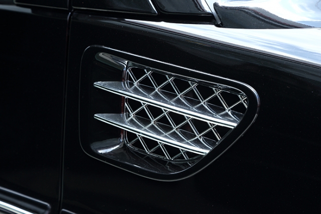 黒い弾丸のごとき硬質かつスタイリッシュにデザインされたエクスプローラー。サイドフェンダーに設けられたエアベントもアグレッシブなアクセントとして効いている。ロールーフは、非常にシャープな印象をもたらすために、豪華さを押し出すよりも、スタイリッシュなカッコ良さがにじみ出る。