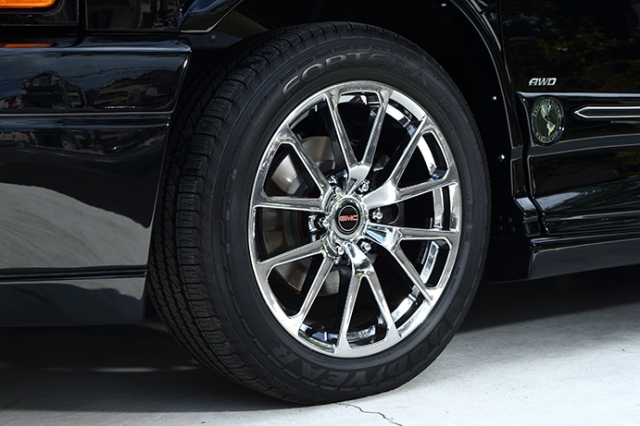 分割タイプの6本スポーククローム20インチホイールが、全体の印象を引き締める。大径クロームフロントグリルと相まって、ブラック&クロームのコンビネーションがキマっている。