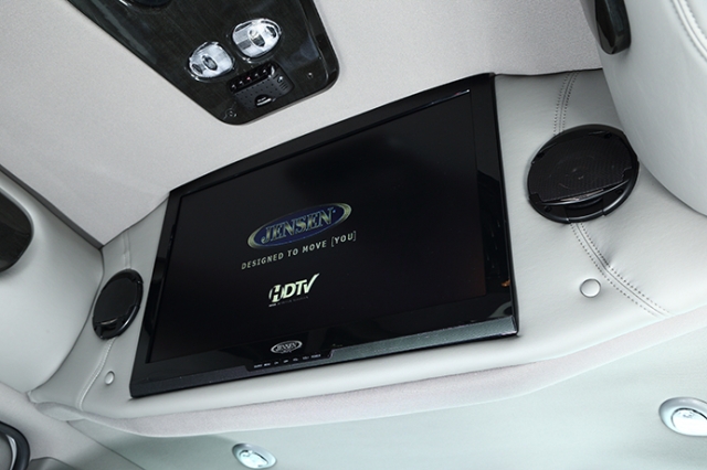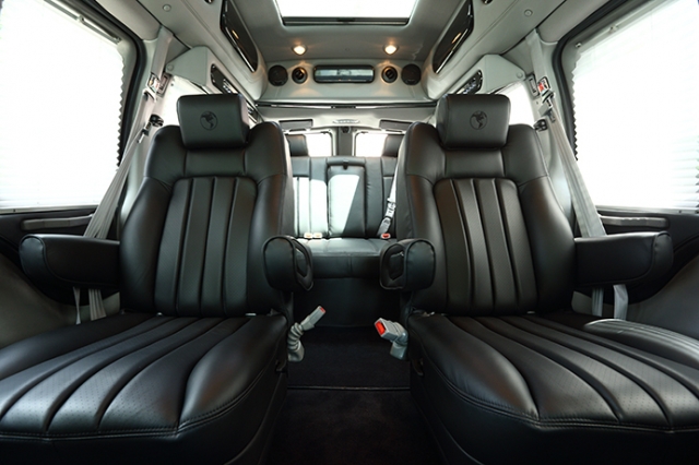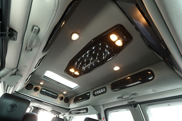 ハイルーフということで、頭上空間が広まっているから、セカンドシート、サードシートへのアクセスは当たり前のように超スムーズになり、ロールーフに比べて全体的にルーミーである。さらに圧巻の26インチ巨大モニターが装備されており、センターコンソールにはブルーレイプレーヤー、その他エアコン、HDMI入力端子や120V電源・12V電源が用意されており、ゲーム機を持ち込んで大人数で遊んだり、撮影した動画をその場でチェックすることも可能等、リア居住空間の快適性やエンターテイメント性が格段に向上されている。