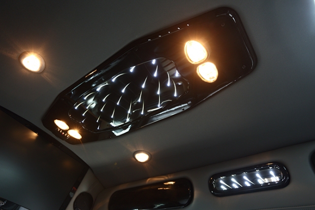 ハイルーフ化されたことで、ルーフにあるスペースを有効に使うことができるよう、各部にイルミネーションライトや小物収納スペースが多数設けられている。