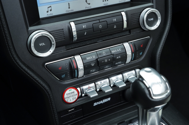 センターコンソールは全般的に使い勝手は良好。写真左下の赤いボタンがエンジンのスターターボタン。また各部のスイッチ類や手に触れる各部の質感や硬質な印象は、「これがマスタング?」と言わしめるほど、良くなっているし、世界的にも絶賛されている。