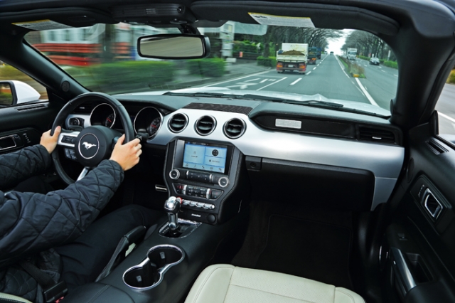 2016型のマスタングコンバーチブル、まずもって座った感じが最高である。フロントウインドーの長さや角度とダッシュボードとの関係性が絶妙でありオープンカーらしい開放感が味わえる。