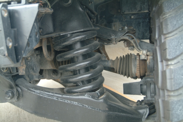ブレーキは、普通車軸のハブに設置されているが、ハブリダクションの兼ね合いで、H1のブレーキはドライブシャフトとデフの接合部に設置されている。インボードブレーキという。