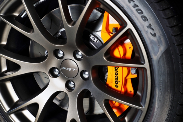 鍛造の20インチホイールに組み合わされるブレンボブレーキはオプションのオレンジカラーにペイントされる。ヘルキャットのエンジンブロックに塗られるオレンジを意識したものだ。