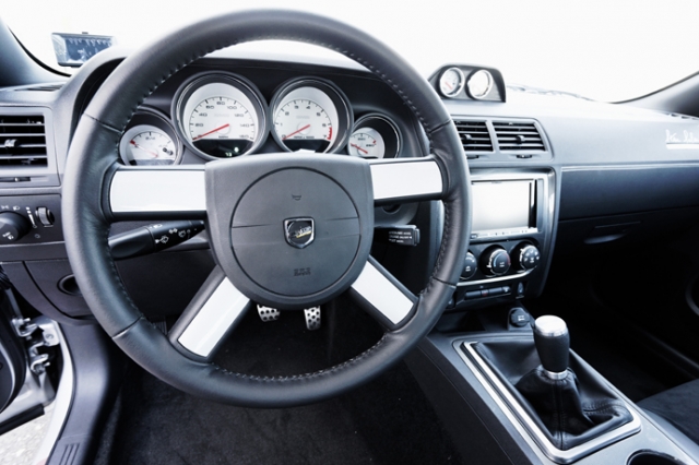 6速MTを備えたインテリア。ホワイトメーターはシートカラーとのコーディネートもなされる。確かに味気ない気もするが、だがノーマルチャレンジャーのインパネよりは10倍は魅力的である。