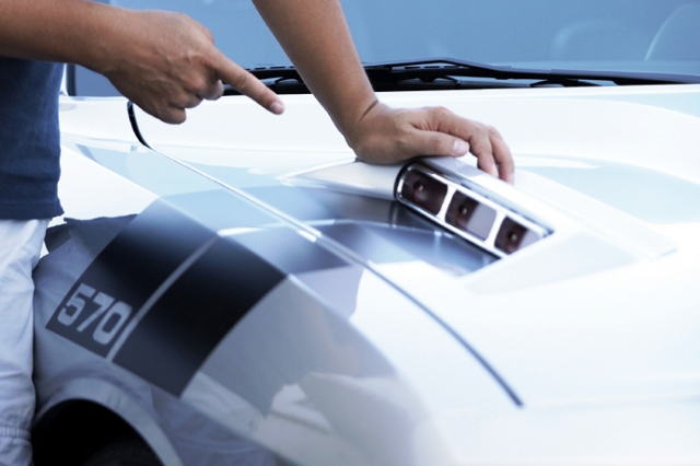 それはともかく、SMS570チャレンジャーにはさらに楽しくなる演出が施されている。それはボンネットに装備されたエアファンネルだ。左右4個ずつのバタフライがアクセルに連動し開いたり閉じたりするから感動する。まさに、男子の憧れがそこにあるといっていいだろう。個人的には色気のないエンジンカバーを強化アクリルを通して見せるコルベットZR1のエンジンフードよりずっと好感が持てる。どうせやるなら、この方がアメ車らしい。