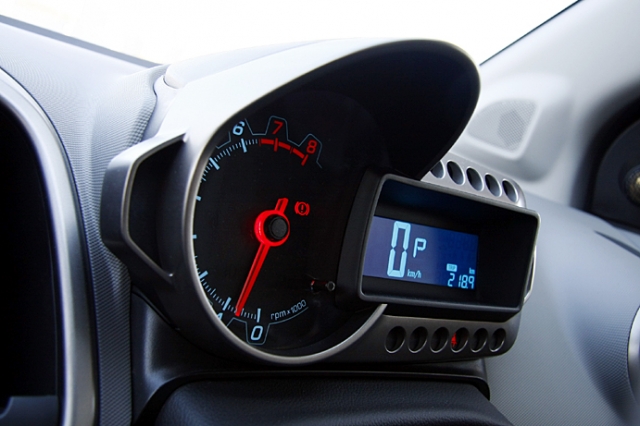 タコメーターとデジタルメーターが組み合わされたメーターは、モーターサイクルにヒントを得た斬新かつ大胆なデザインだ。