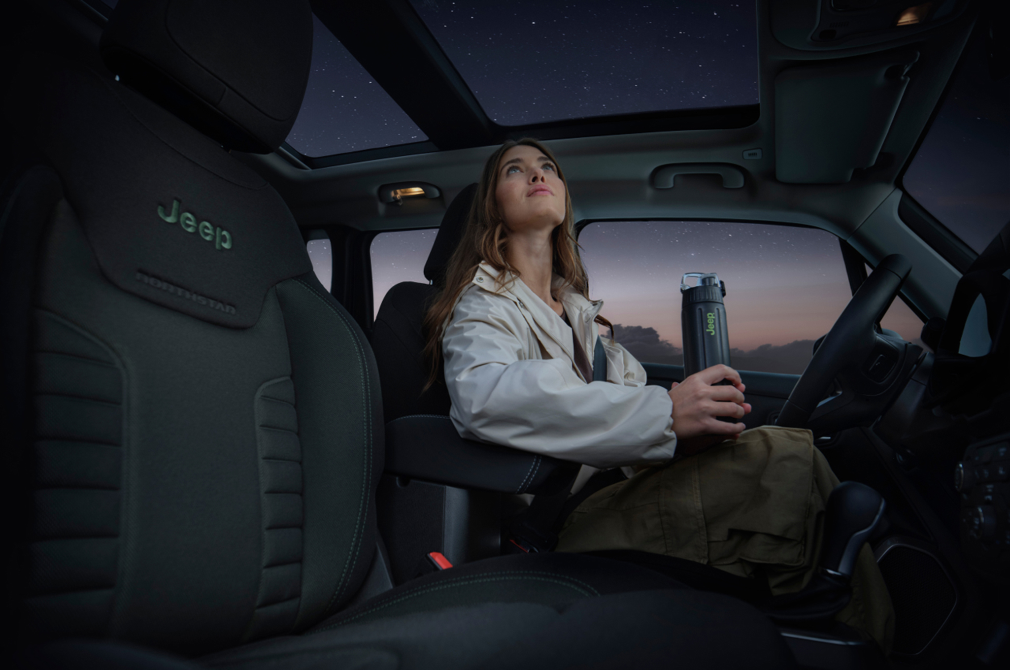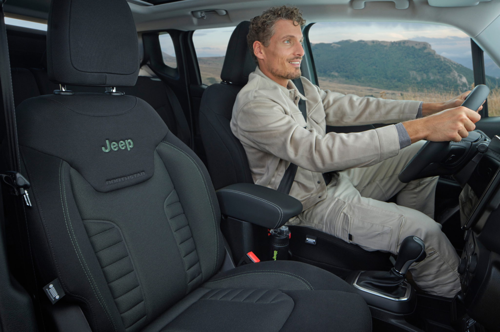 一方インテリアでは、ジープで初めて採用された高強度ファブリックの専用シートが配され、エアコンベゼルやシートのステッチなどにグリーンのアクセントを取り入れている。くわえて、デュアルペインパノラミックサンルーフを標準装備し、どのシートからも広い空を望める開放感が味わえる。