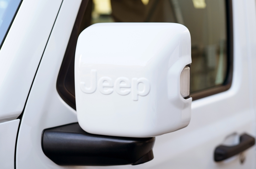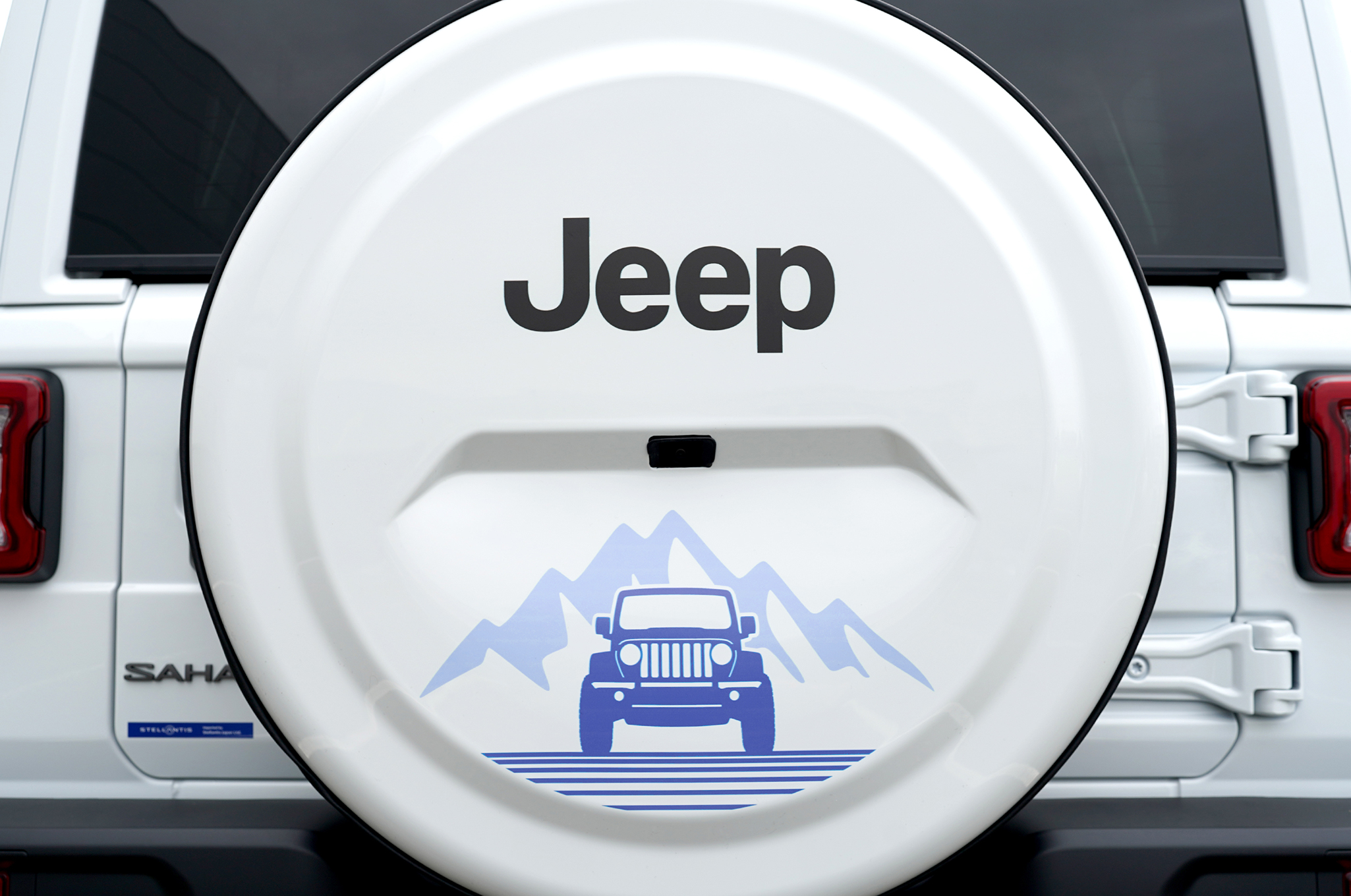 車両の背面には、「Wrangler」のイラストをプリントしたホワイトのハードタイプスペアタイヤカバーを装備し、ジープロゴ入りのホワイトドアミラーキャップとあわせ、白銀の世界をイメージした一体感のある仕上がりになっている。