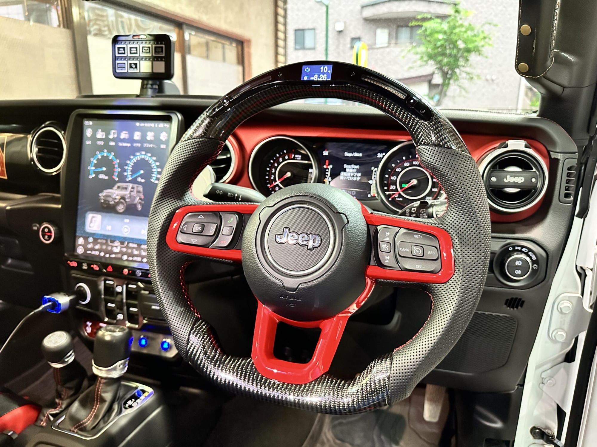 ハンドル交換ならこれ!LEDカーボンレーシングハンドルでJLラングラー(グラディエイター)をカスタム専用のAndroidナビへの交換で、大画面タッチパネル・CarPlay・Google Maps・Bluetooth通話に対応。