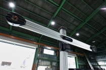 この十字に見えるキャスター装着されている機器がアライメントテスター。両サイドにあるCCDカメラによる最先端の3次元画像処理を駆使して計測する。上記写真のターゲットと連動している。