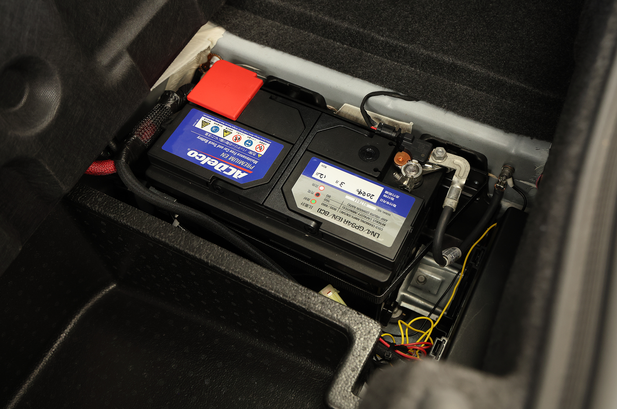 カバーを外し、バッテリーを確認する。まず分かるのが、バッテリーマイナスターミナルに繋がる配線上に位置するセンサーの存在。これ、電流値をモニターしているセンサーであり、このセンサーが車載コンピューターにバッテリーの状況等の情報を伝えている。