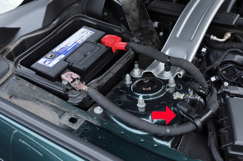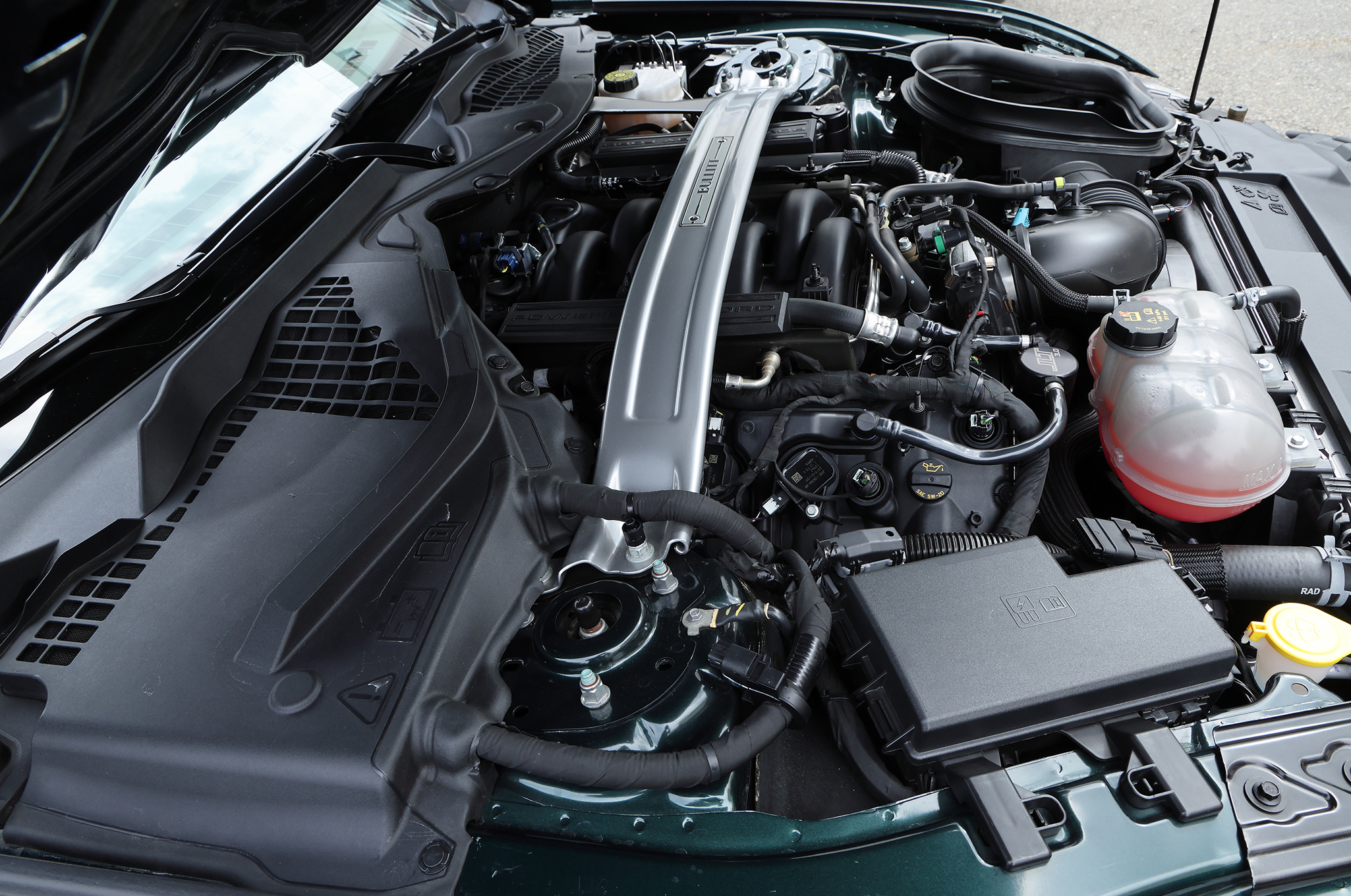 マスタングのバッテリーは向かって左上位置にある。余談だが、ダッジチャレンジャーの場合はリアトランクに、シボレーカマロの場合はリアトランクサイドにバッテリーが搭載されている。