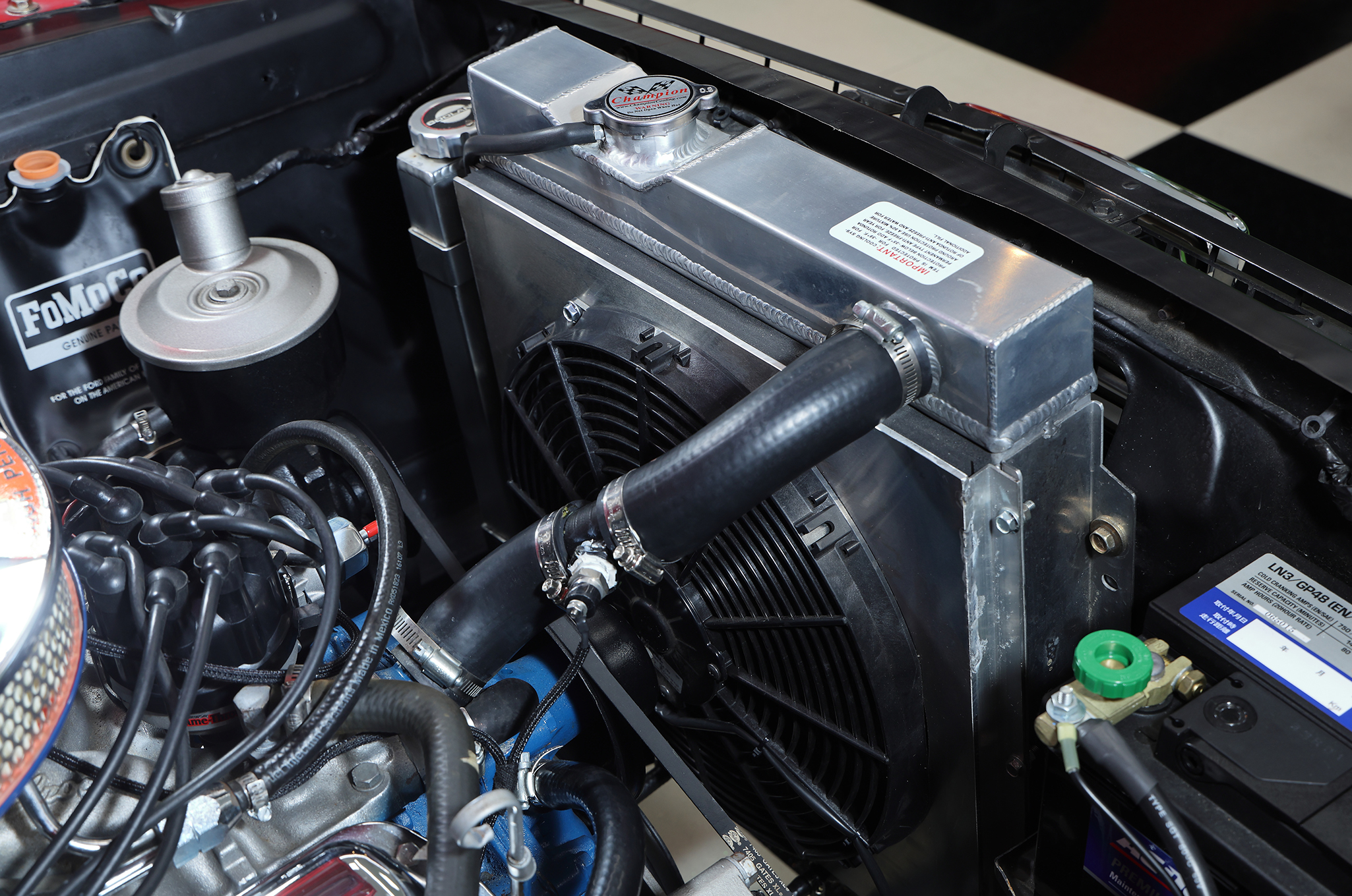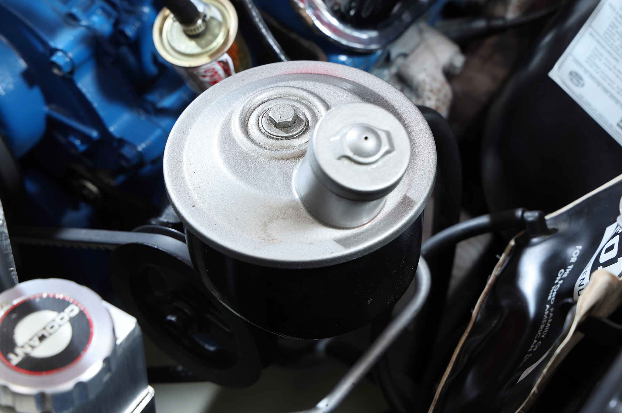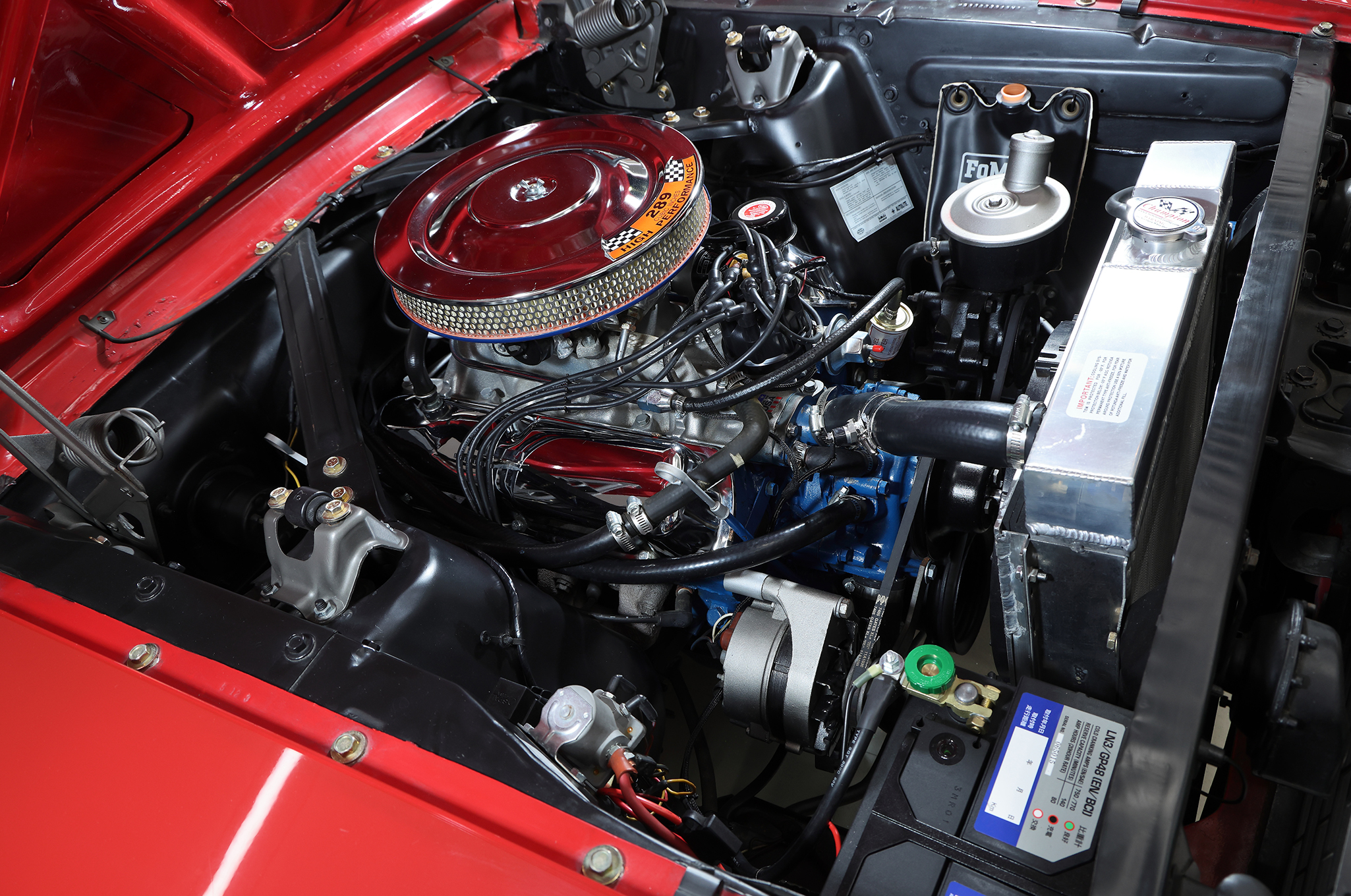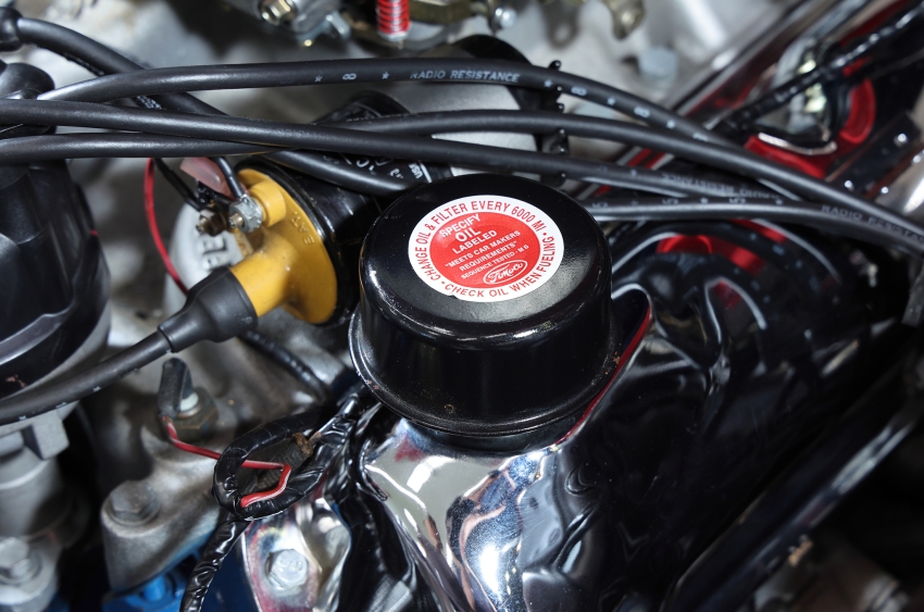 ▲搭載されるエンジンは289cuinのV8。換装品ではあるが、キャブレター、インテークマニホールド、ラジエーターを含む冷却系から点火系に至るまでモディファイされている。