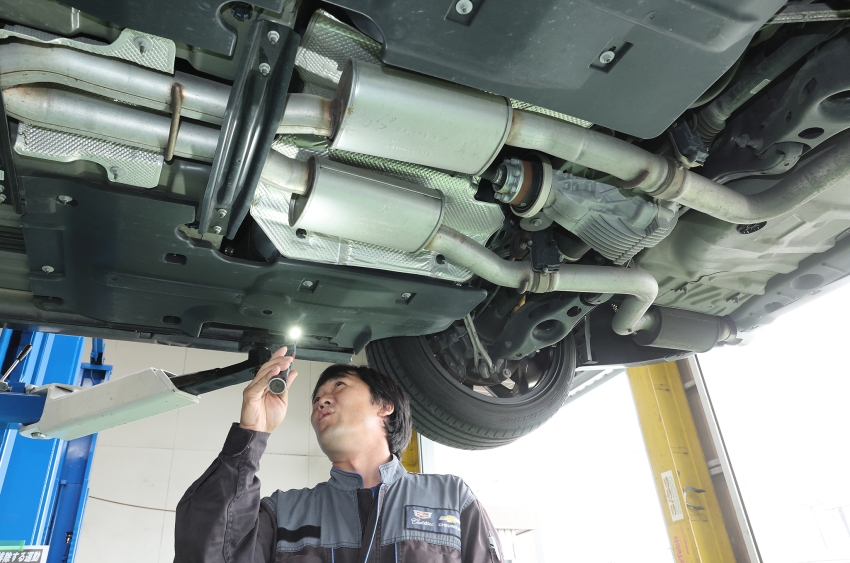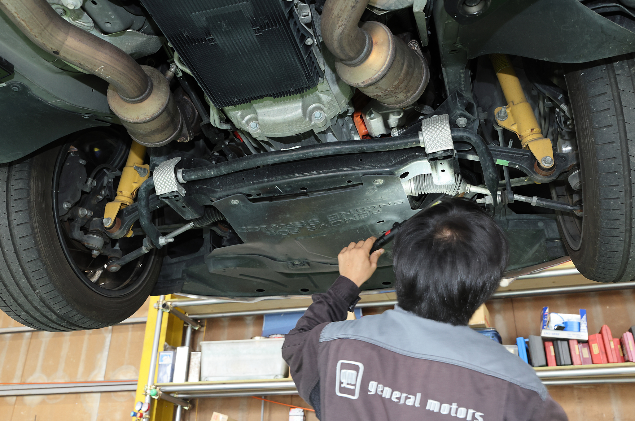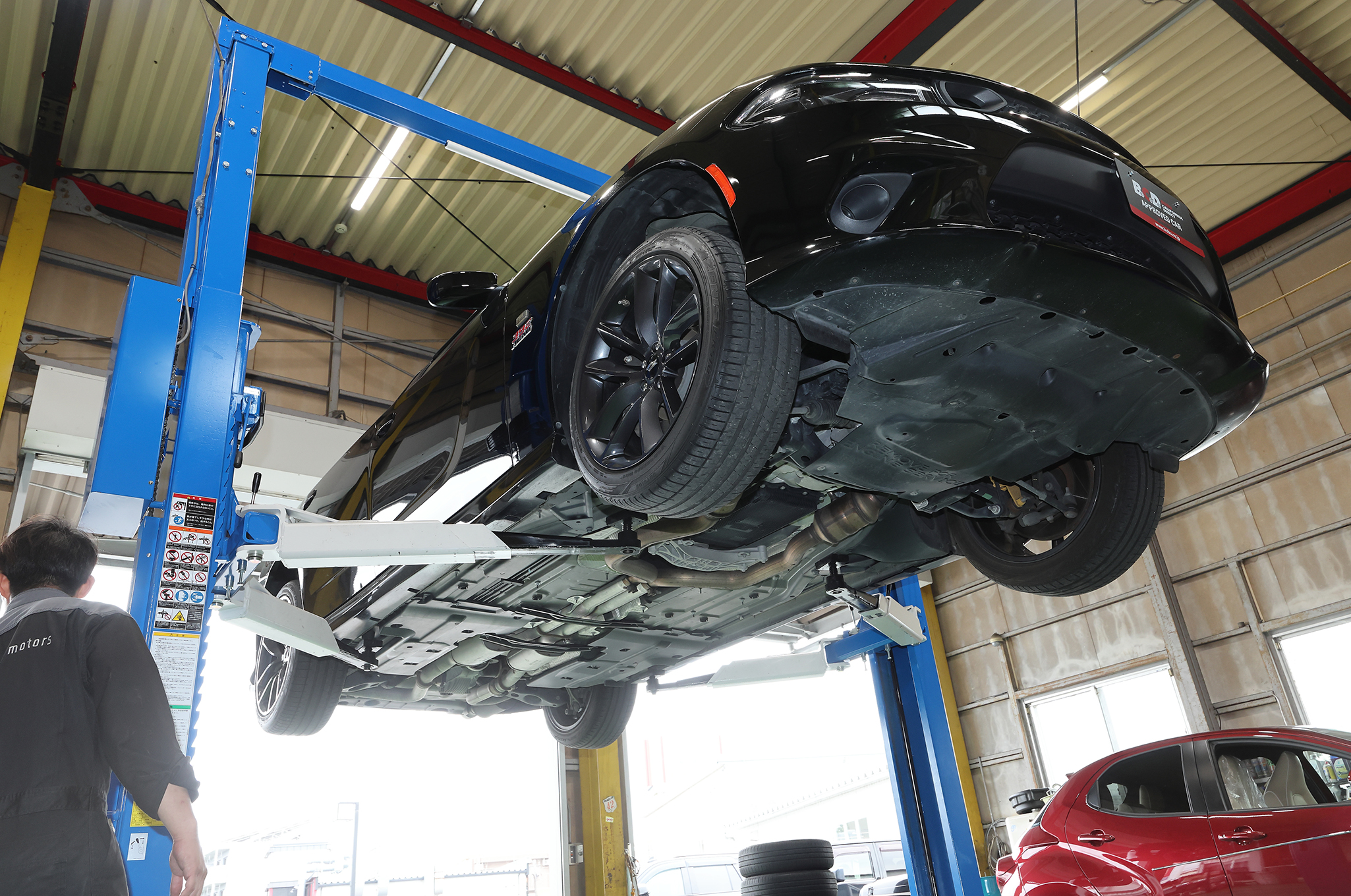 ▲BCD認定中古車のアフターフォローはBUBU全店において同レベルが確保されている。リフトにて下回りチェック。
