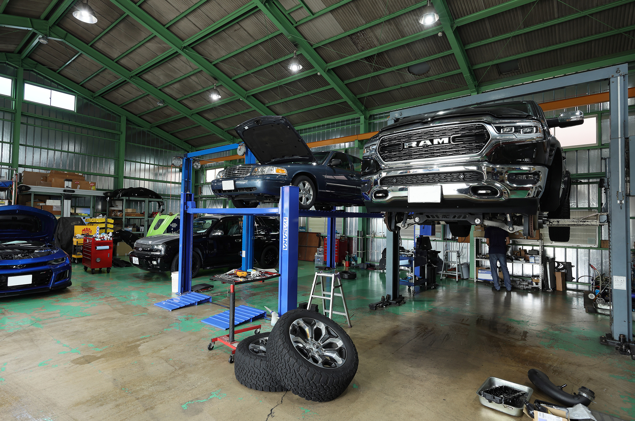 取材当日対応していた車両は、2010年モデル以降の現代車から最新モデルに至り、またテスラありと、今の日本のアメ車ファン層を表した、まさに理想的な工場に見えた。