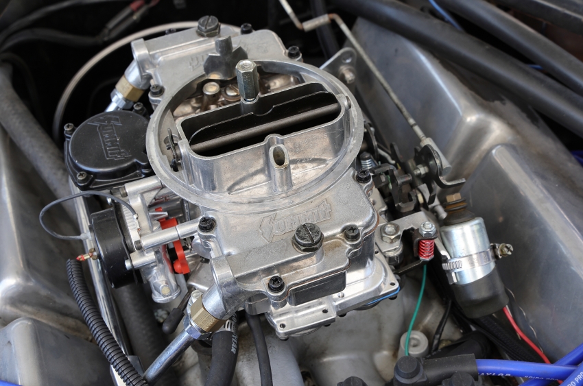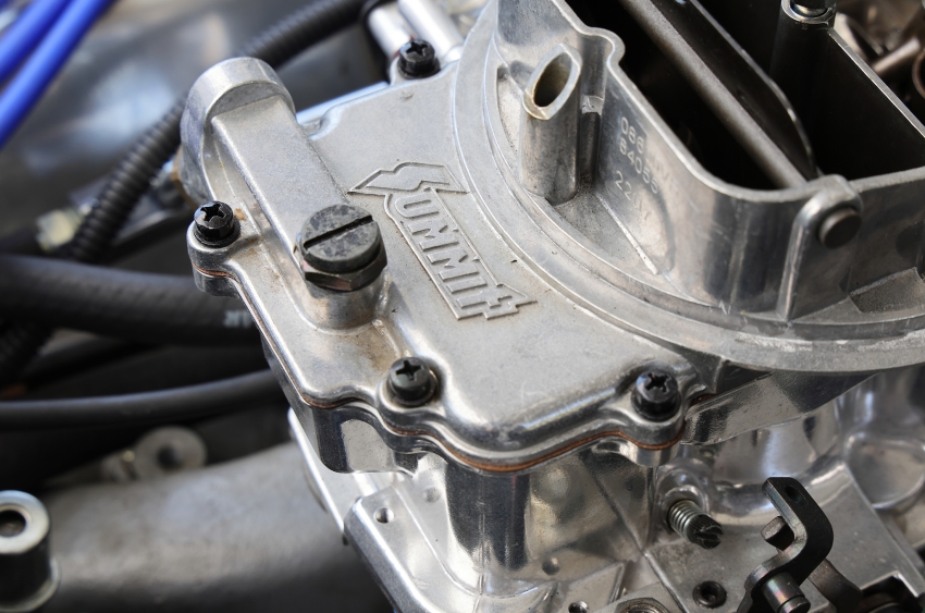 コブラのエアクリーナーを外すとサミット製のキャブレターが装着されており、このキャブレターをエーデルブロックの500cfmの4バレル2ステージに変更するという。現段階でも普通に走るが、もう一段コンディションを上げるとともにキャブの性能を向上させるためという。