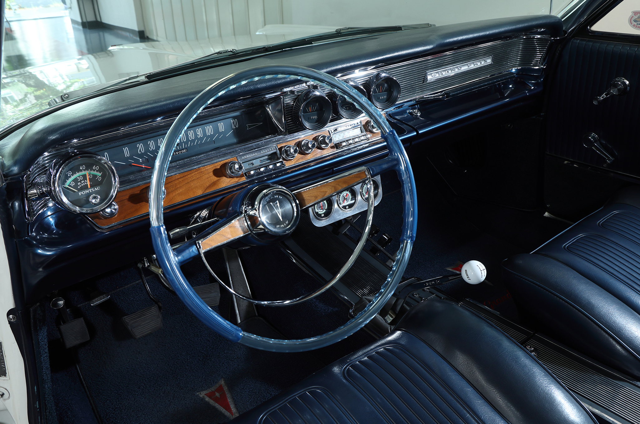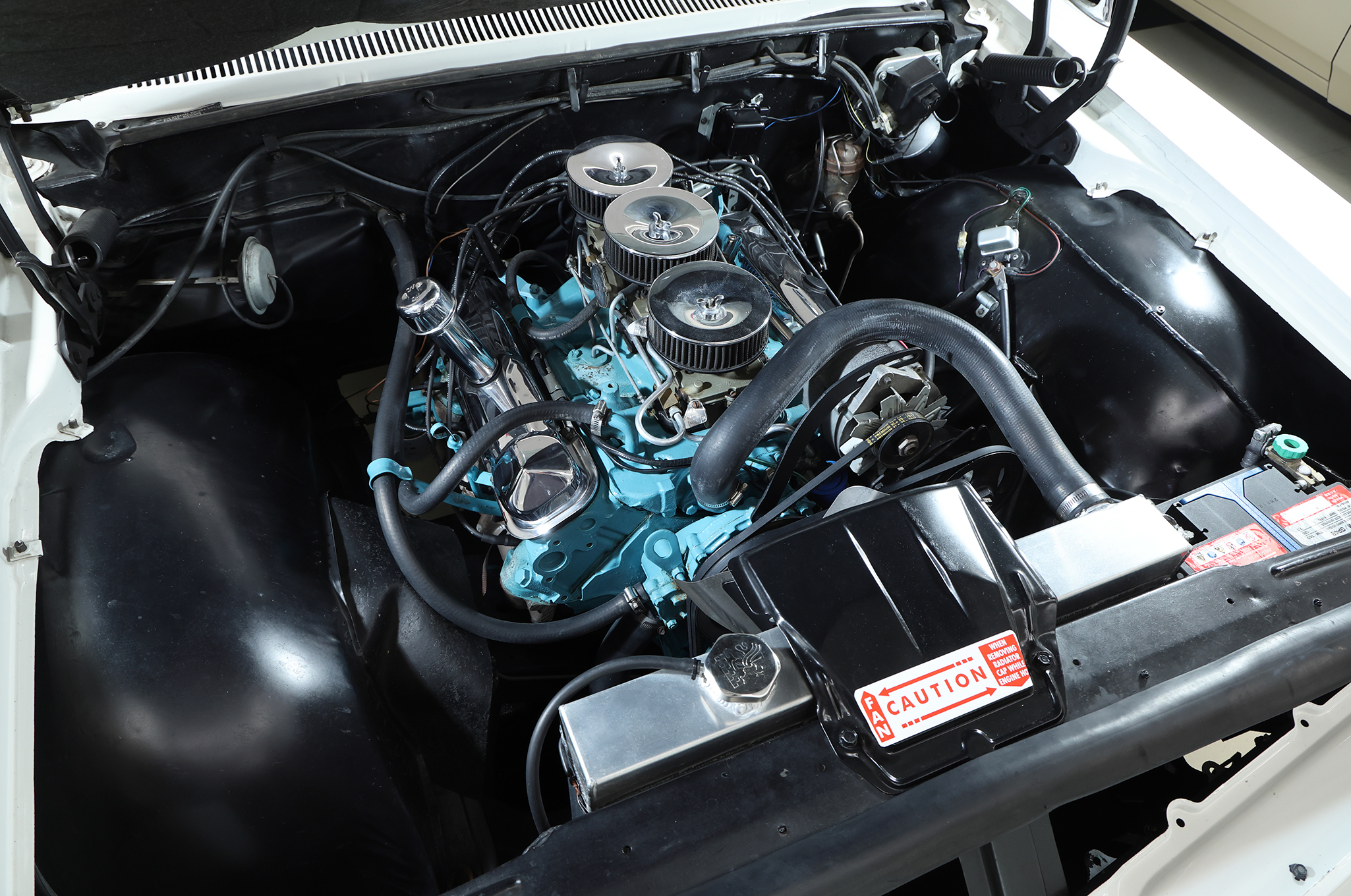 ということで、取材個体。BUBUビンテージが輸入した64年型グランプリ。この個体はオリジナルストック状態をキープしつつ、各部を強化した個体。搭載エンジンは389キュービックインチ=6.4リッターV8エンジンで、2バレル×3連キャブレターのトライパワーを装備し360hpを発生させる。