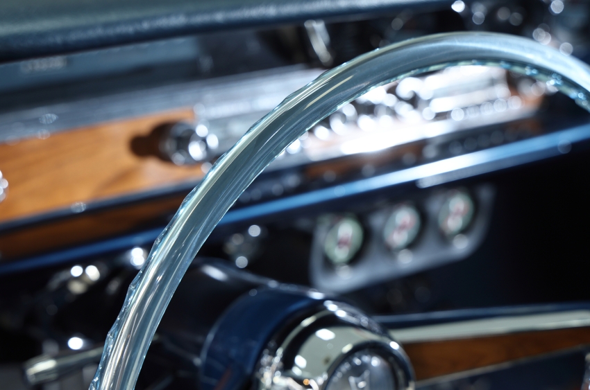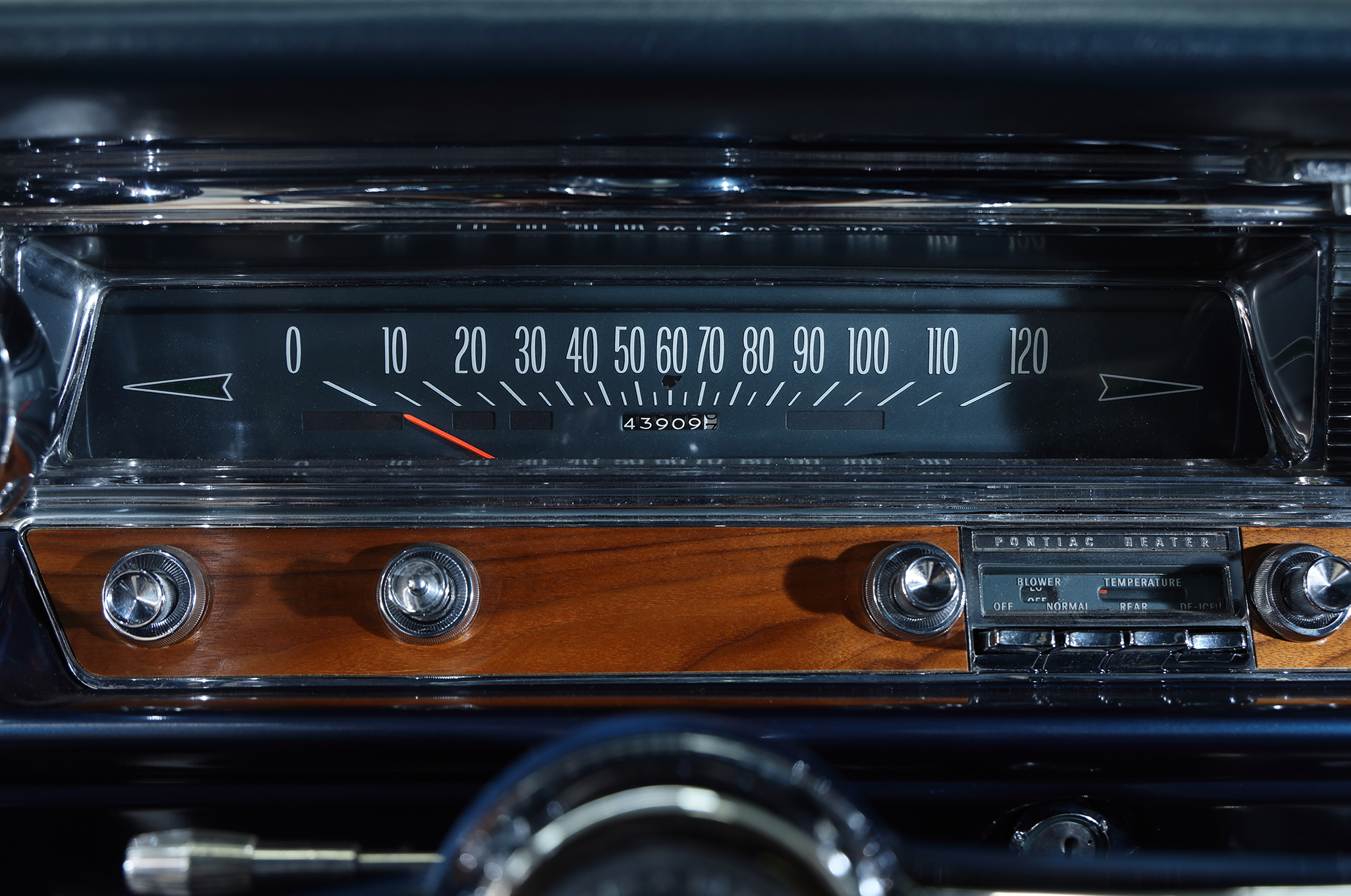 で、64年型のグランプリであるが、全長5メートルを超える2ドアスペシャリティクーペ。これだけを見ても分かるインパクトの強いデザイン。スクエアな二分割グリルやボディサイドラインには、ほんのりだが50年代的デザインの名残を感じ、インパネメーター類を見るとその確証を得る。針が横に流れる横長のスピードメーターがその証である。