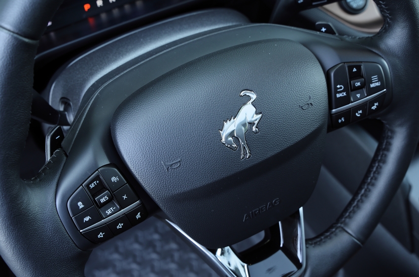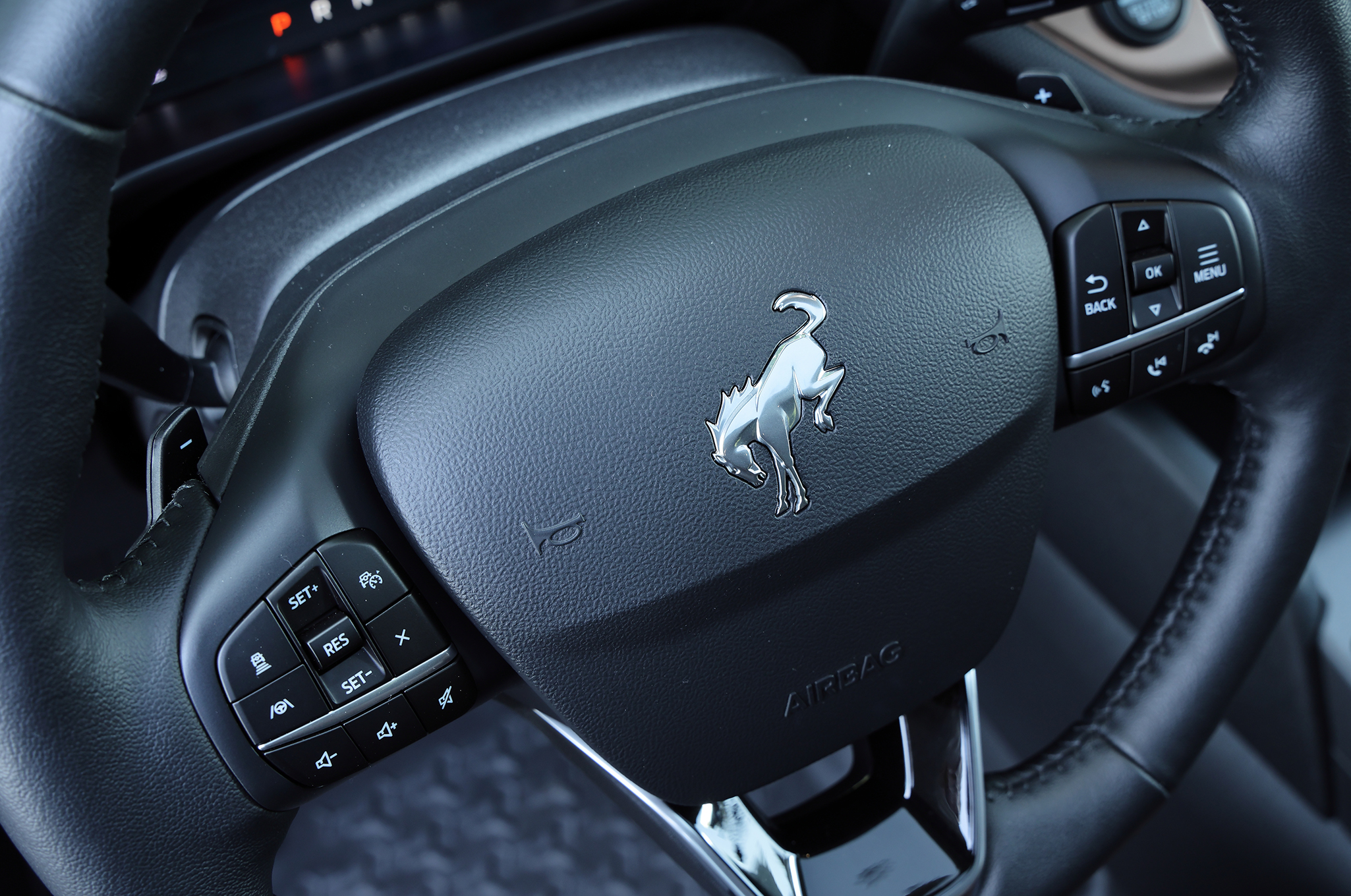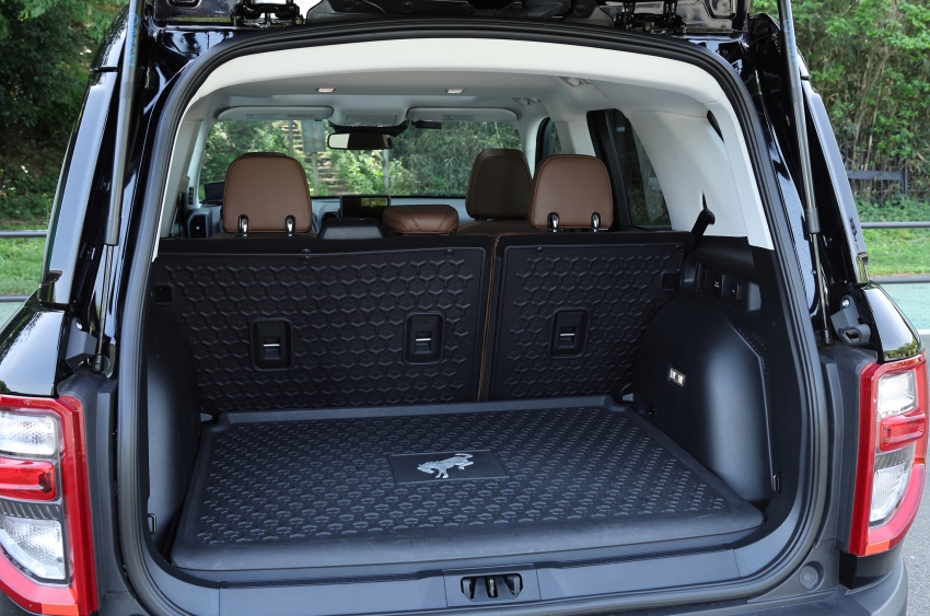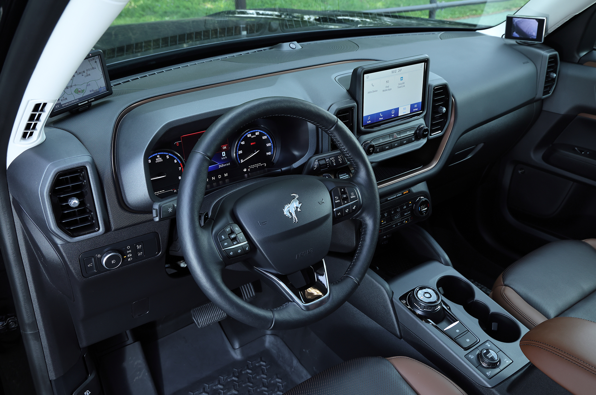 ということで、取材車両。2022年型の「Badlands」。ブロンコスポーツは、平たく角ばったデザインをしているが、ドライバーズシートに収まると窮屈さは微塵も感じない。逆に、このサイズにしては驚きの室内空間であり、5人乗車としてはかなり広々とした印象だ。