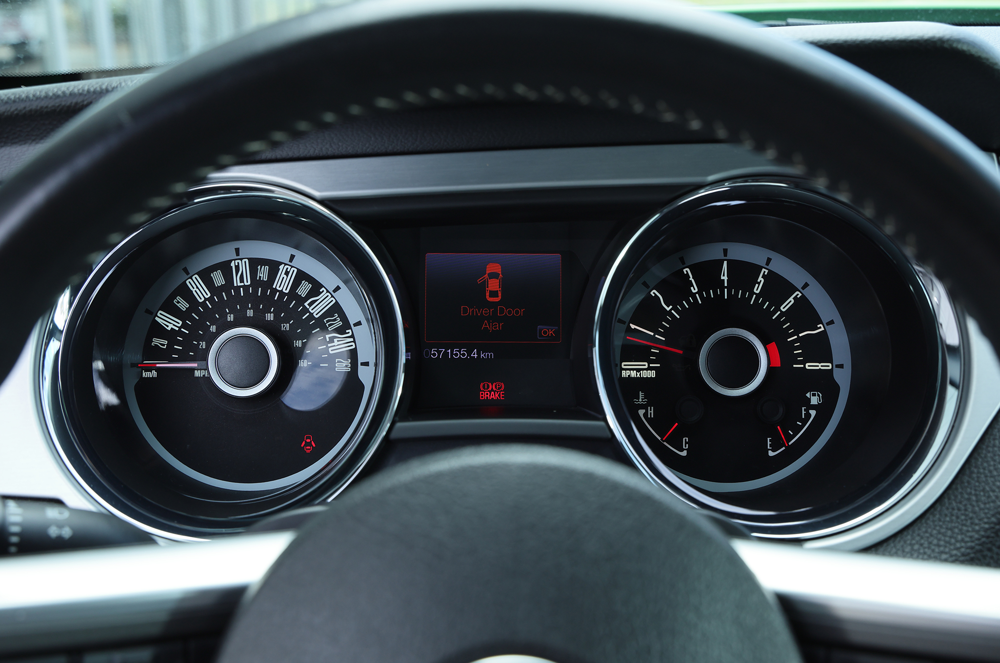 ▲エアコンやオーディオは使いたい放題だし、何かに我慢する事がほとんどない。だが、エンジンはまるで旧車V8のような密度の高い息吹を発し、ドライバーを満足させる。官能的という言葉があるが、この型のマスタングV8は見事に当てはまる。
