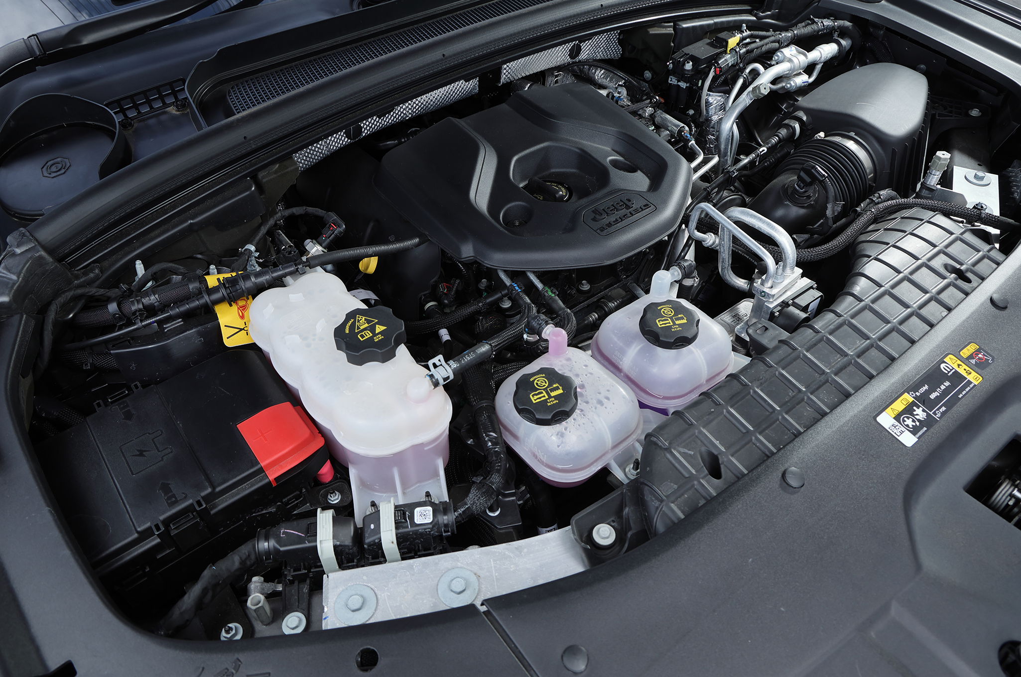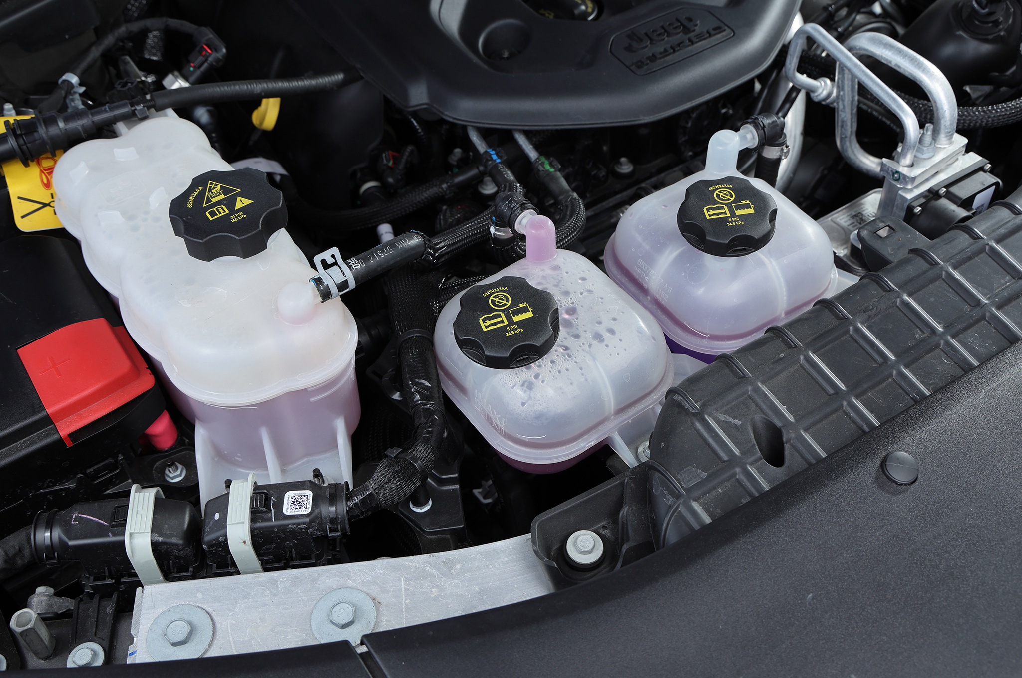 ▲向かって左位置にあるエンジン冷却水。中央にあるのはモーターやバッテリーを冷やす冷却水。ともに定期的に量の確認が必要になる。