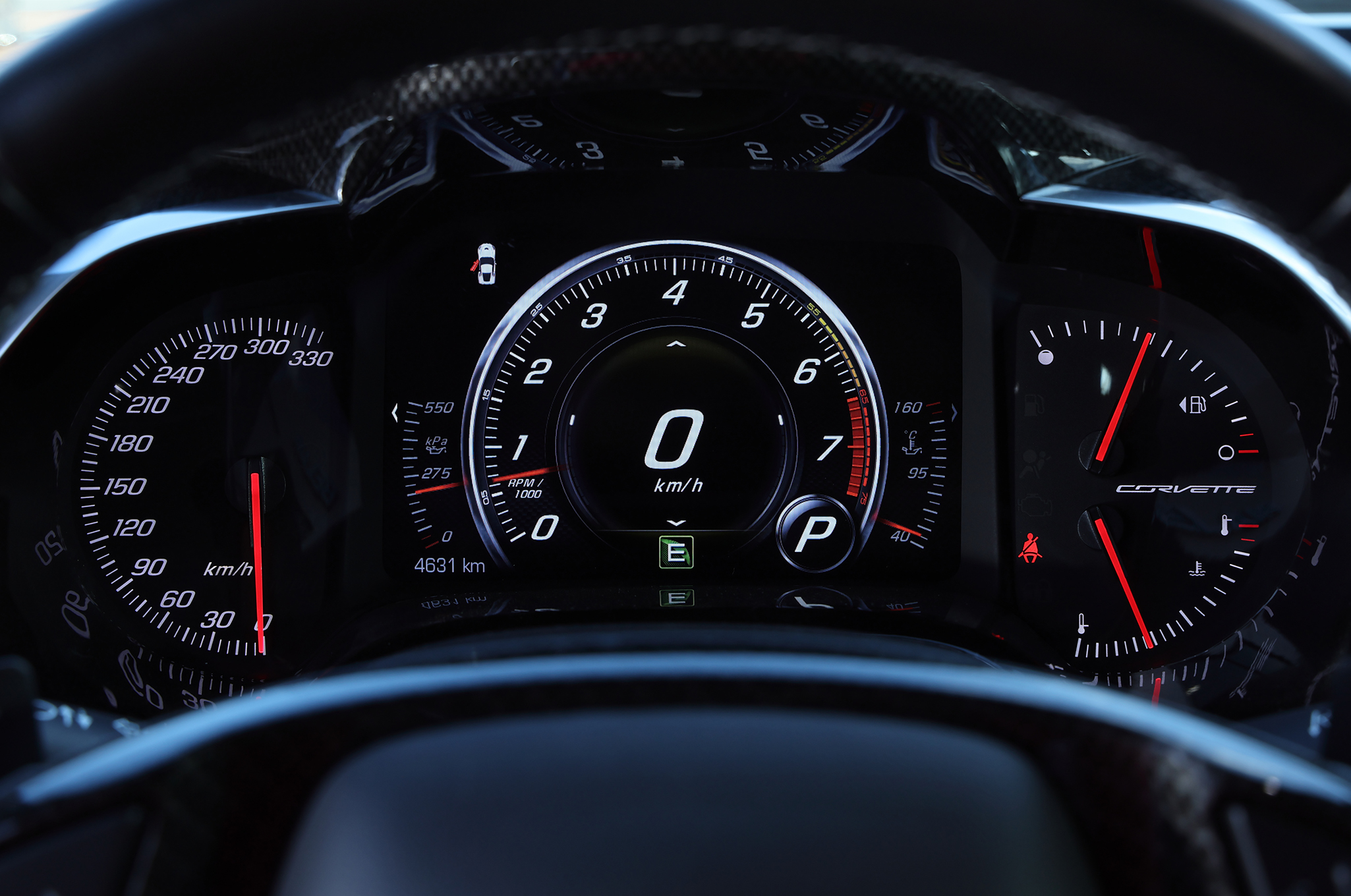 ▲メーターは液晶ディスプレイになっており、タコメーターを中心としたスポーツカーならではのもの。スピードメーターは330km/hまで刻まれている。