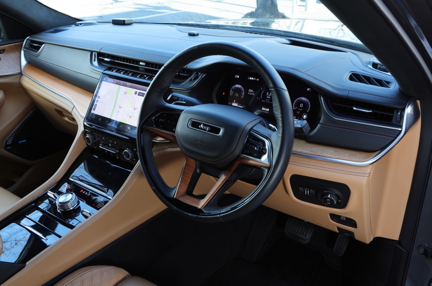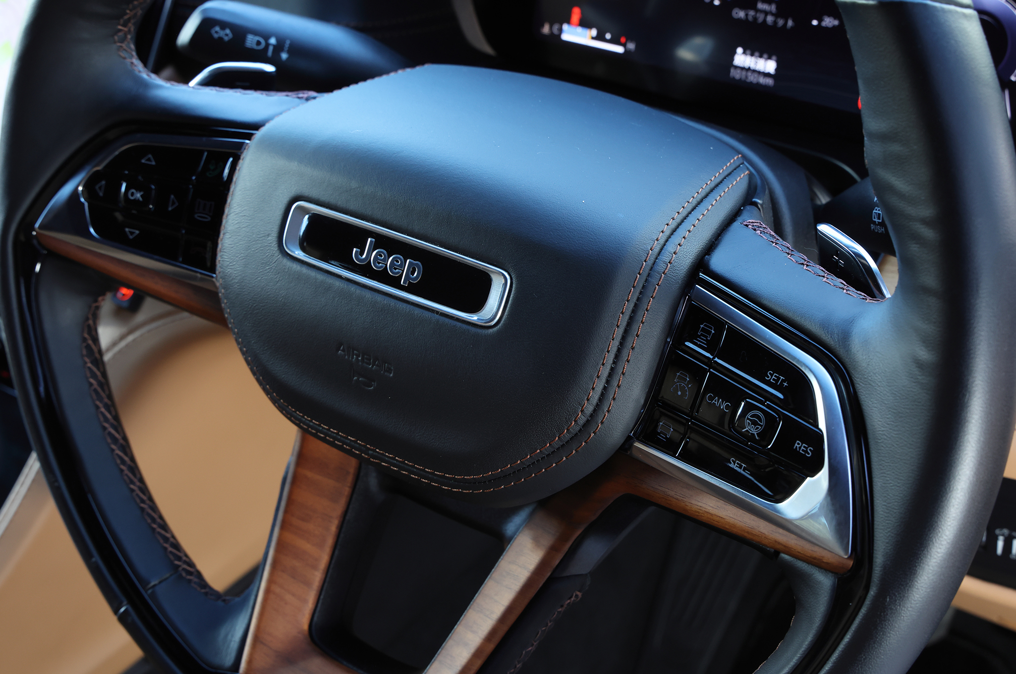 プラスして室内の豪華なインテリアも魅力。上質であり、洗練されており、とにかくお洒落であるから高級車オーナー的な所有感で満たされる。全体的にスタイリッシュで、メーター類のデザインも洗練され、ジープのトップモデルに相応しい質感であるとともにこれまで感じたことのない上質感が備わっている。