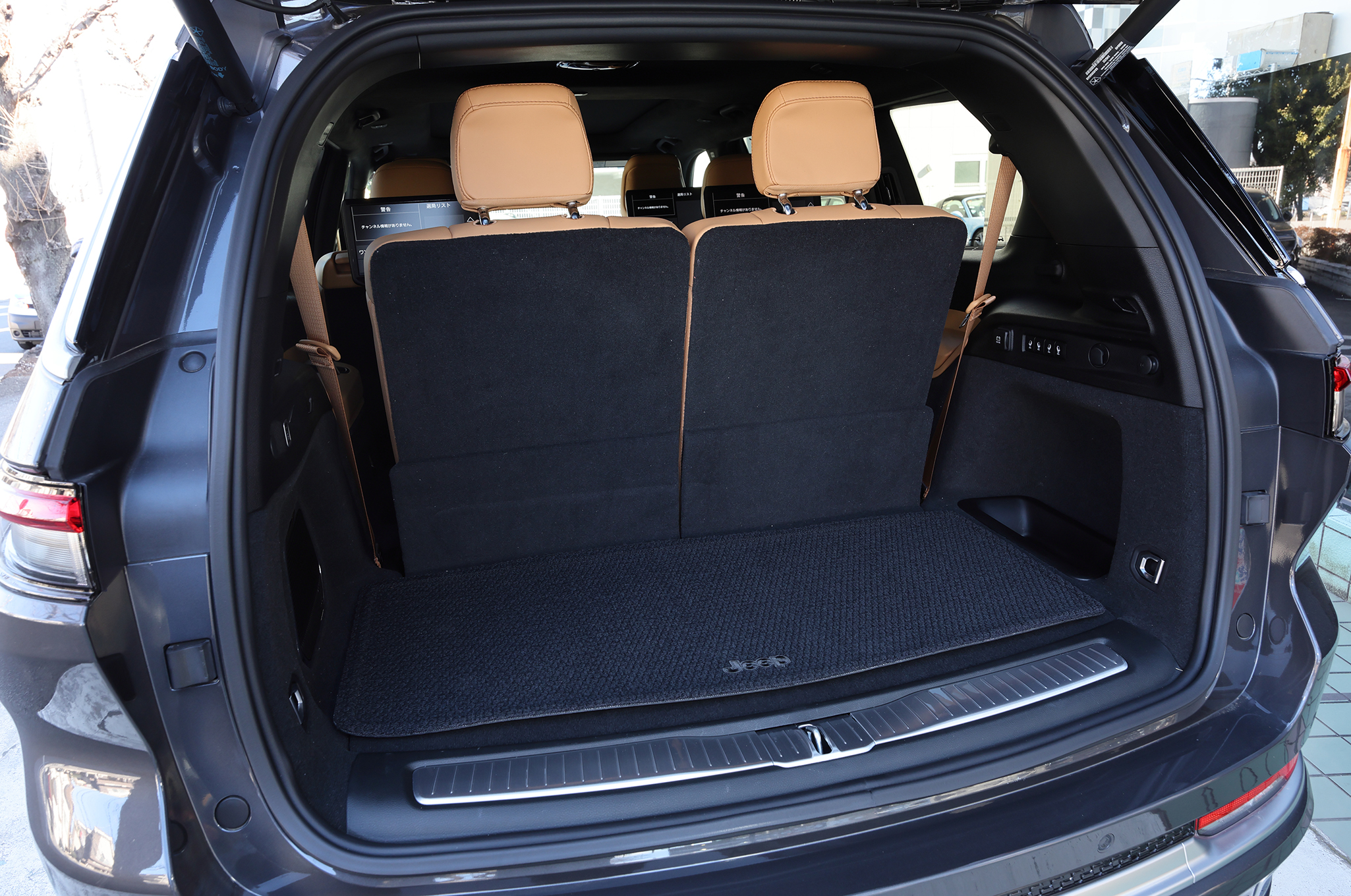 ということで、取材車。2023年型グランドチェロキーL サミットリザーブ。走行約1万キロの個体。ディーラー車ベースの中古車であり、内外装ともに目に付く瑕疵はなく、インテリアも上々、そしてリアシートや荷室に至っては使用感すらない個体。