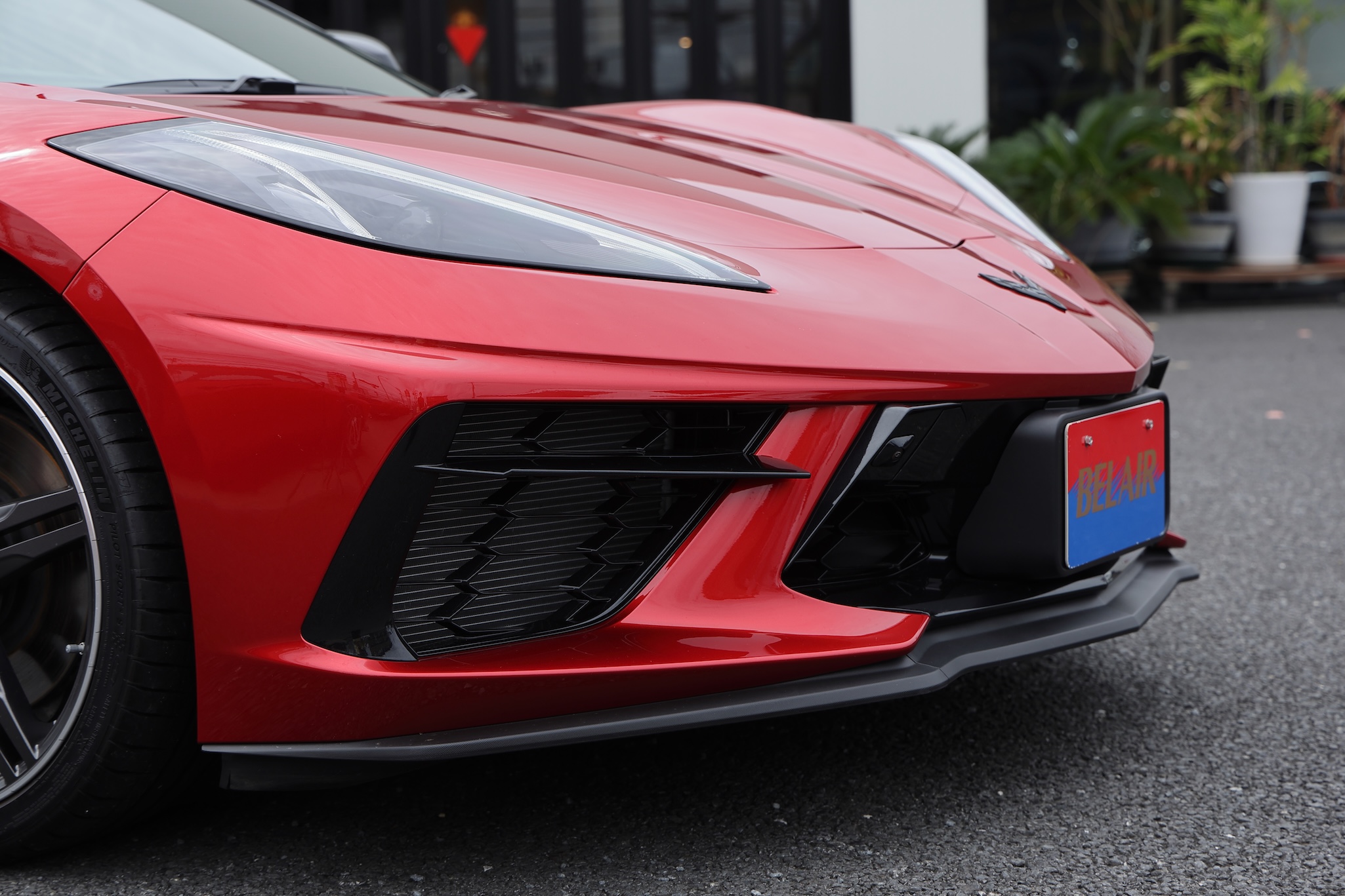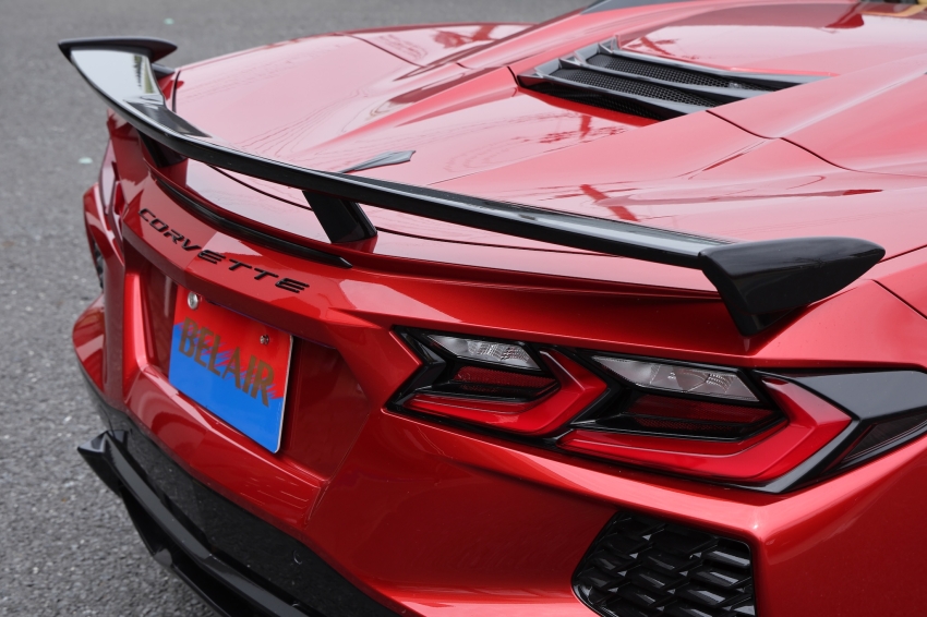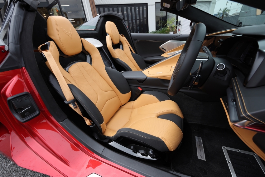 非常にエレガントかつクラス感のある大人仕様で、アメリカ的高級感を漂わせる。外装ブラック内装ブラックや外装ホワイト内装ホワイトのオールブラック&ホワイトも非常にクールだが、今回の個体はルーフ部分とナセル部分をブラックにペイントするオプションも加えられているから、ボディカラーとブラックとの2トーンデザインが、より一層C8の魅力を高めている。そしてアメリカ的雰囲気で満たされる。