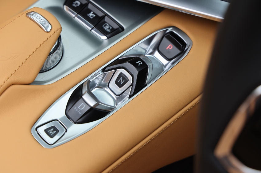 ▲室内からのギア操作は電気式のボタンスイッチ。パーキングブレーキもボタン操作。ミッションは8速DCTを組み合わせている。