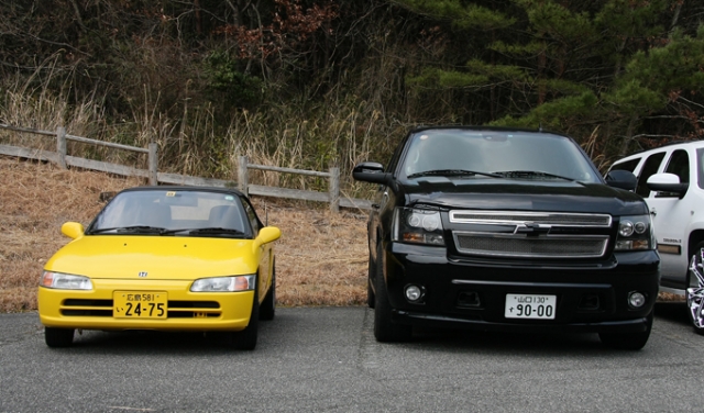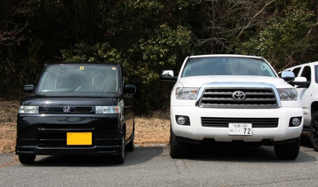 USトヨタ・セコイアの横にあるのはホンダ・ジャッツ?。ちょっと前のモデルだと思いますが、ビートくらいの世代の軽と比べると随分と大きいですよね? 今のタントとかNボックスとかはもっとデカいもんなぁ…