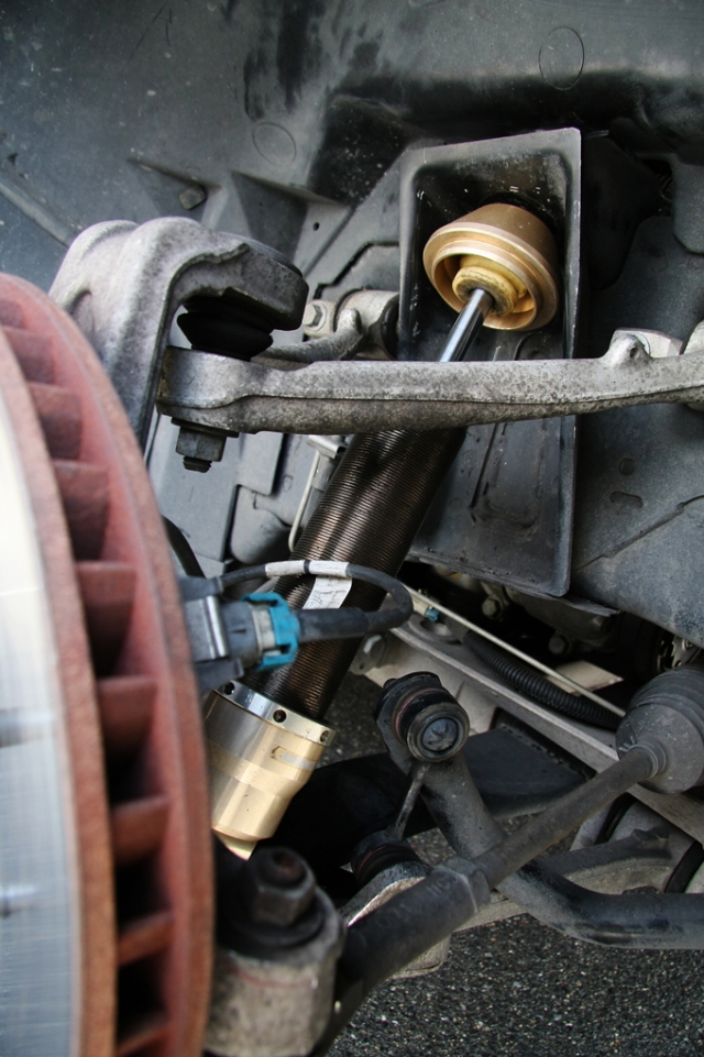 ノーマルの横置きリーフスプリングを残したままでダンパーをザックスの車高調タイプに交換。車高はノーマルよりも若干下げられている。